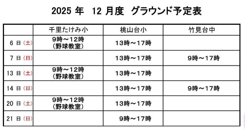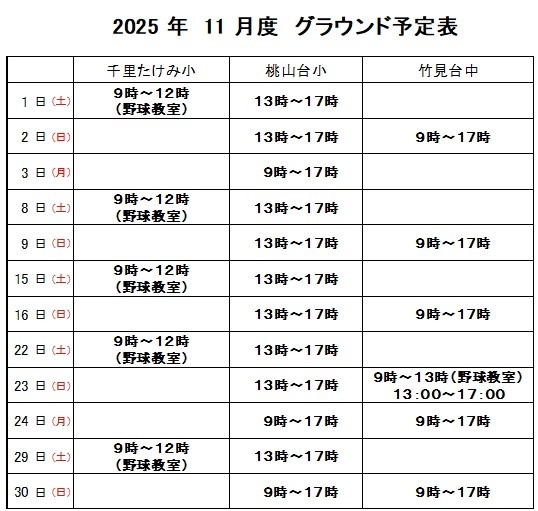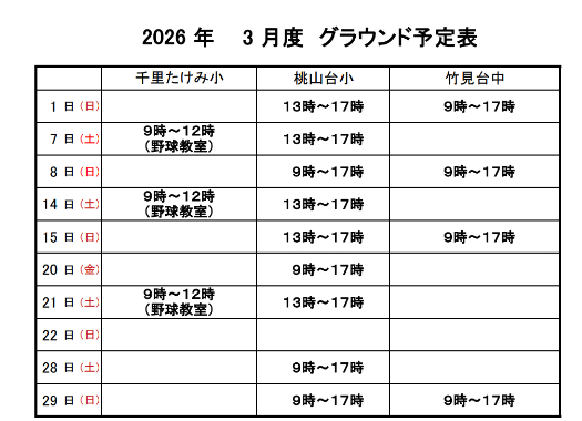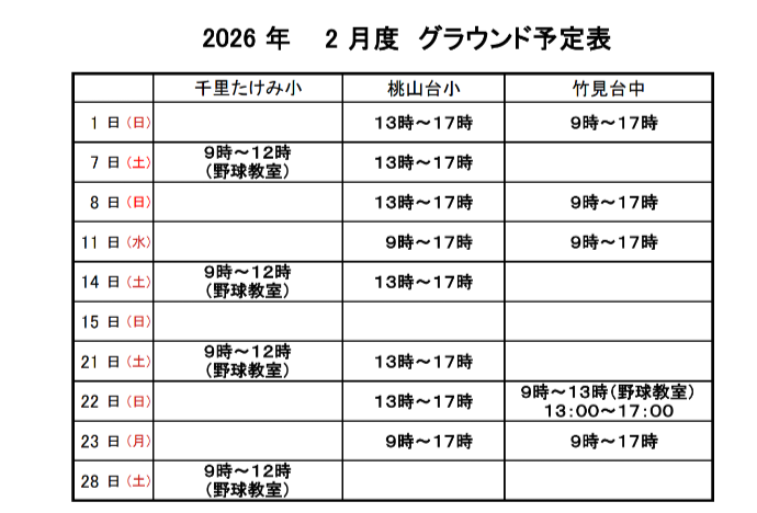 ※試合等によりグラウンド使用状況が変わる場合があります。※チーム体験や練習見学をご検討いただいている方は、お問い合わせメールをご遠慮なくお送りください。※練習場所が2か所ある日があります。試合やチーム事情により、体験可能の場所が替わる場合がありますのでお手数ですがお問い合わせの上、ご検討ください。※試合予定は、おおよそ水曜日夜に確定します。※次月予定は、25日以降に決まります。